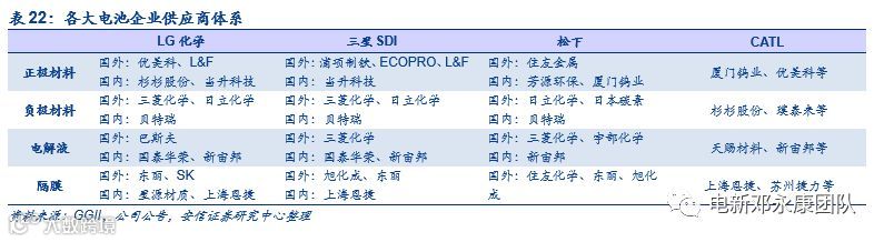 综合对比:LG化学、三星SDI、松下的动力电池供应商主要以日韩系为主,部分消费类电池和储能类电池采用国内供应商,在供应商产品品质方面优于国内企业,CATL主要采用国内供应商,凭借自身在锂电材料方面积累的丰富经验,电芯产品品质与日韩企业差距较小,产品成本具有优势,未来随着国内中游材料企业的技术不断提升,LG化学、三星SDI、松下国产化后,国内企业极有可能成为其B点供应商,达到降低电池成本的目的。
