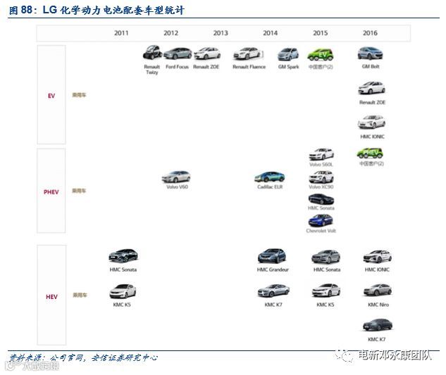 在EV领域,LG配套的量产车型主要有雷诺的Twizy、ZOE、Fluence,福特Focus、通用的Spark、Bolt,HMC IONIC等国际热销车型,累计销量近29万辆。在PHEV领域,LG配套的量产车型主要有沃尔沃的V60、S60L、XC90,凯迪拉克ELR、雪佛兰Volt、荣威e950、荣威e550等全球热销车型,累计销量近24万辆。在HEV领域,LG配套的量产车型主要有HMC的Sonata、Grandeur、IONIC,KMC的K5、K7、Niro等热销车型。48V主要为奥迪的SQ7车型。