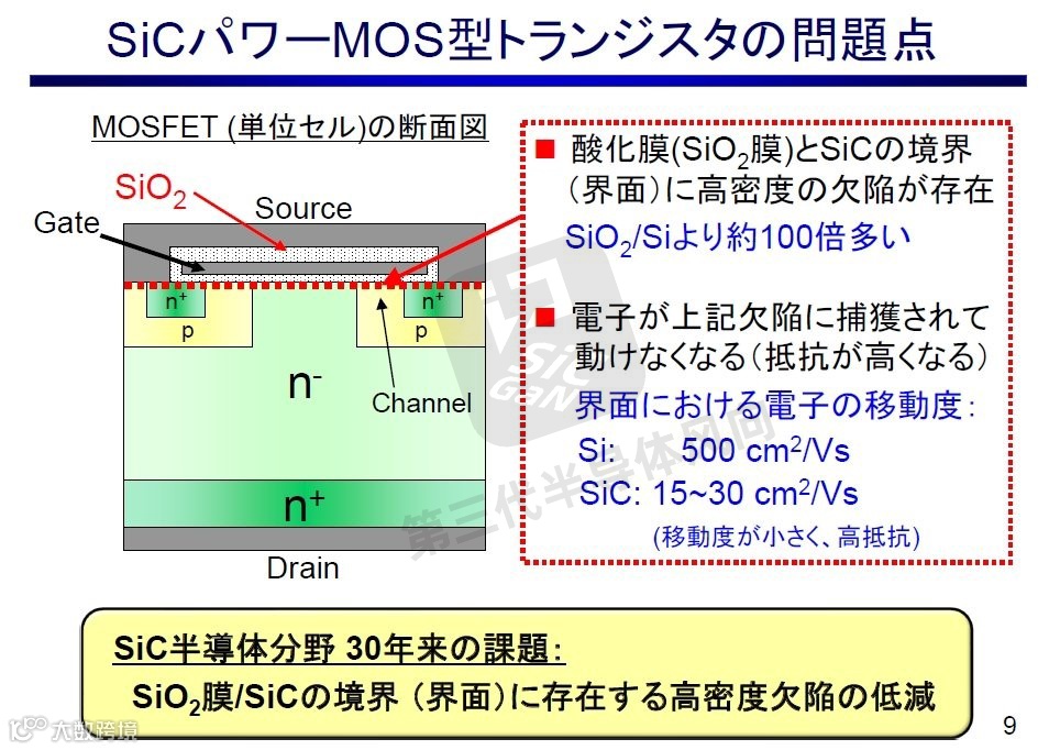 通常,为了在表面形成SiO2膜,SiC-MOSFET在制造时,SiC会被热氧化。但这是传统硅基MOSFET的制作方法,硅晶圆可产出非常高质量的SiO2膜。但是通过热氧化,SiC不仅无法获得高质量的SiO2膜,反而更为严重的是,SiC 与SiO2之间的界面缺陷比Si与SiO2之间多了100倍。