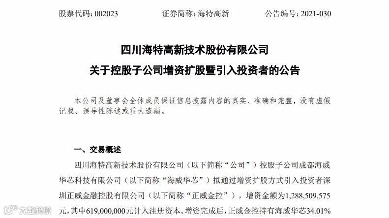 ,而海特高新持有海威华芯的股权比例从51.21%降至