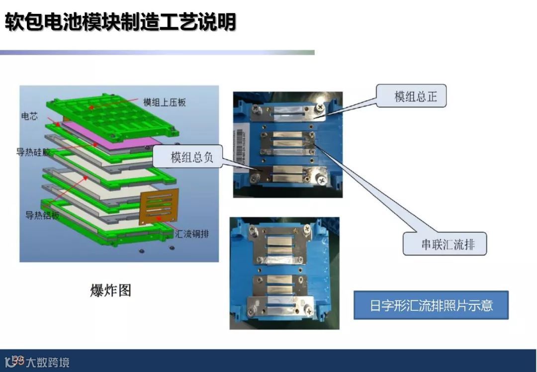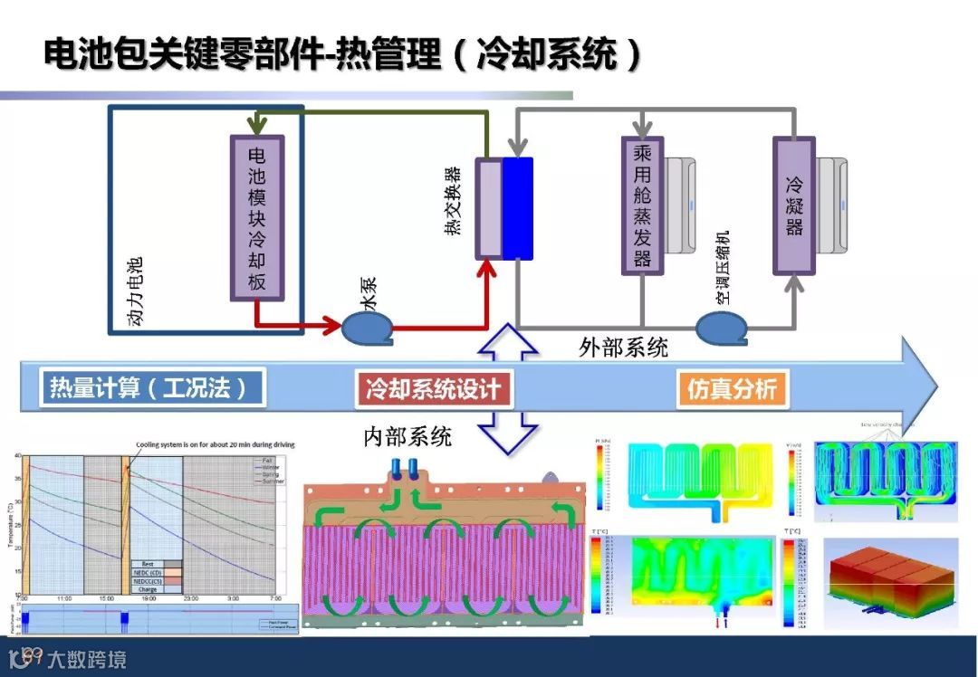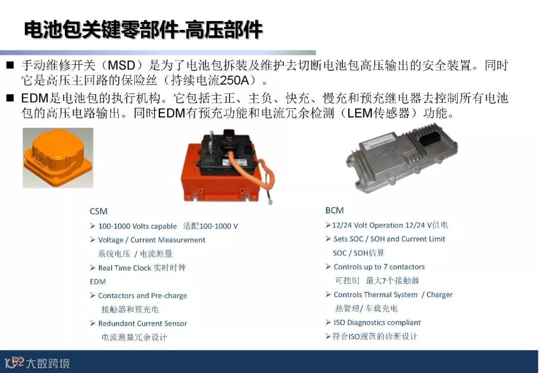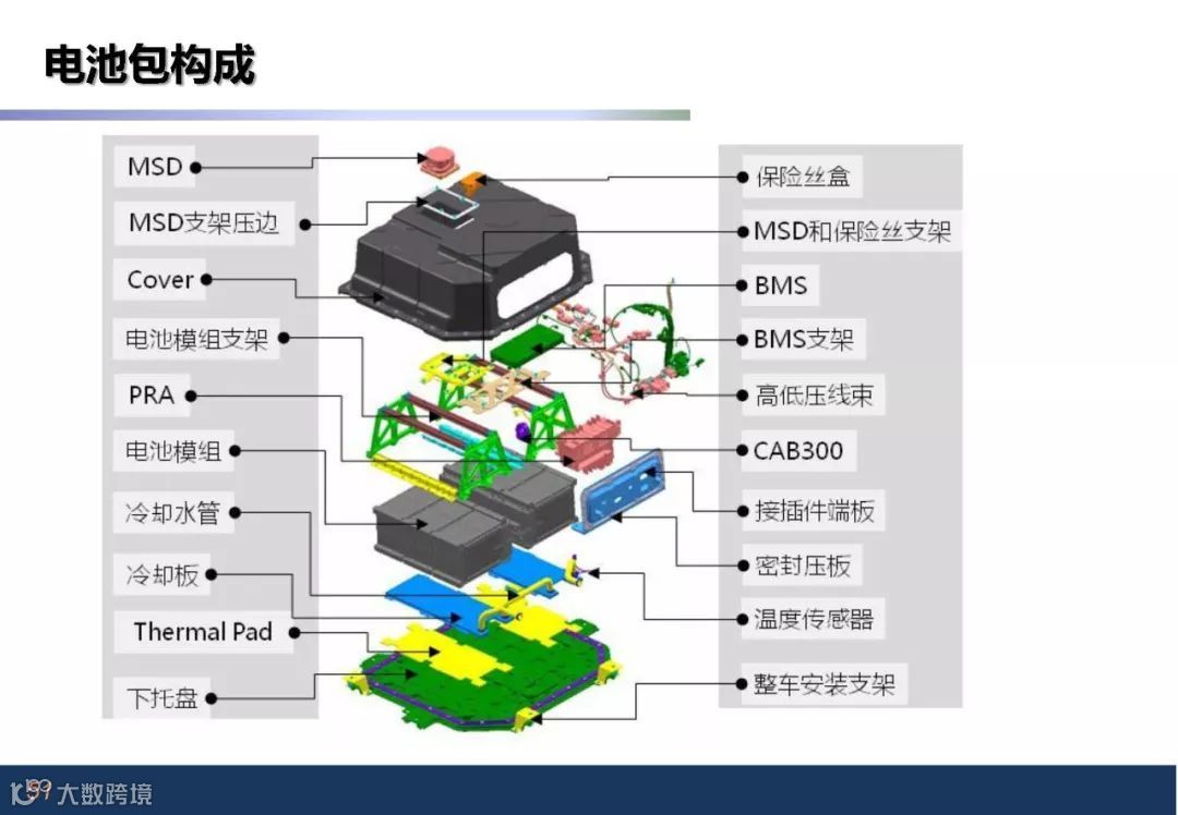 电池包构成部件:模组和 、蒸发器、PTC加热模块、风机、风道及温度采集组成热管理系统;BMS管理系统;BDU模块;软连接及电气接口