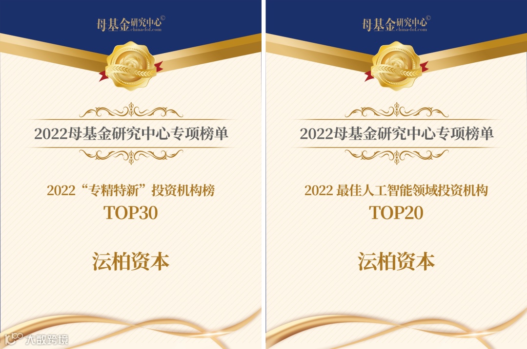 沄柏资本入选母基金研究中心2022最佳PE基金TOP30、2022“专精特新”投资机构榜TOP30、2022最佳人工智能领域投资机构TOP20,沄柏资本创始人、主席鲍毅入选2022最受母基金欢迎的PE基金创始合伙人TOP20,沄柏资本管理合伙人、首席投资官王铮入选2022最佳女性直投基金投资人TOP30和最佳先进制造领域投资人TOP30。