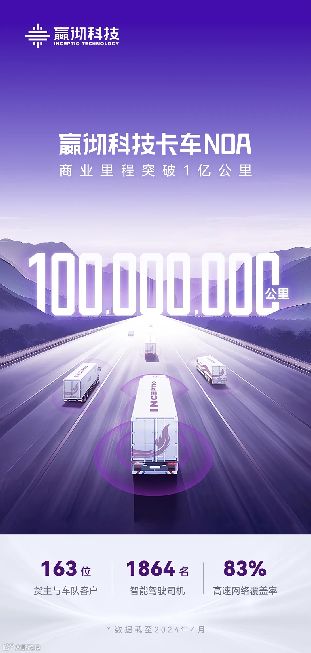 5月7日,嬴彻科技宣布,嬴彻卡车NOA已搭载于多个品牌和车型,安全运营里程突破1亿公里,继续引领行业。这也标志着智能重卡已实现干线物流行业全覆盖,用户价值在快递快运、零担专线、合同物流等各个细分领域均得到充分认可,商业化应用全面加速。■ 阅读更多