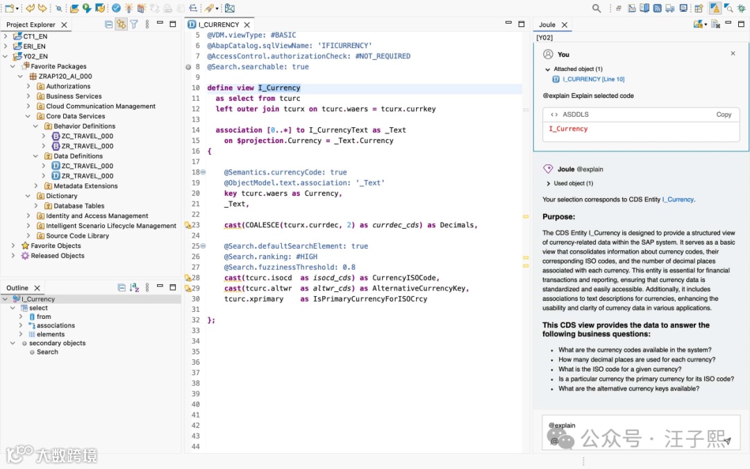 同笔者之前提到的目前市面上主流 AI IDE 和命令行工具一样,SAP Joule for Developers 提供的这些操作也是 context-aware 的,它读取是开发工程内的真实代码,而不是简单地给出泛泛的代码段。