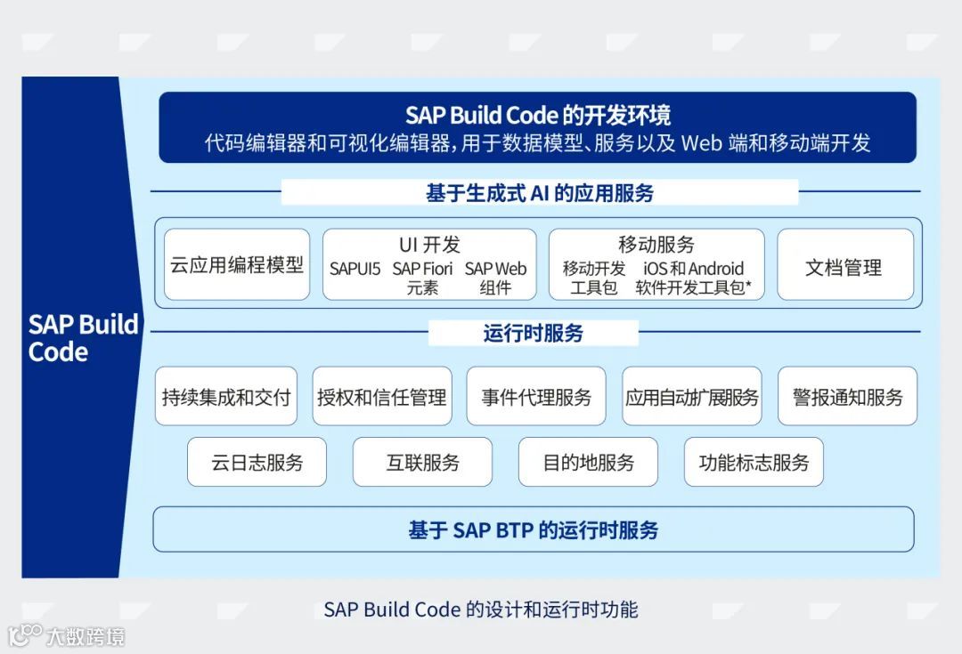 SAP Build Code 的丰富功能让开发人员可以更轻松地扩展 SAP S/4HANA 等企业系统。它基于 SAP BTP 平台构建,整合多款经过验证的 SAP 软件功能,提供设计与运行等多方面支持,能够缩短产品上市周期。其设计功能包含应用构建中央界面、可视化编程工具,以及与 SAPUI5、SAP Mobile Services 的集成,可显著提升开发与测试效率。运行时功能支持一键部署和管理整个开发环境中的软件交付,提供身份认证、互联服务及自动扩展功能,确保应用在初次部署后即可在整个企业使用。