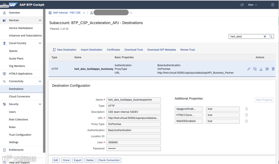 开发过程中,如果是外部地址,往往会存在跨域访问的限制问题,这时候就要在BTP上通过Destination建立代理,写入外部地址的用户名密码信息等才可以在BTP上开发的应用中进行无缝访问,这样还保证了机要信息存储于Destination中而不是在代码里。如下图就是连往S4系统的一个destination,可以直接在BTP各色服务消费,在代码里也可以任意调用,十分方便。