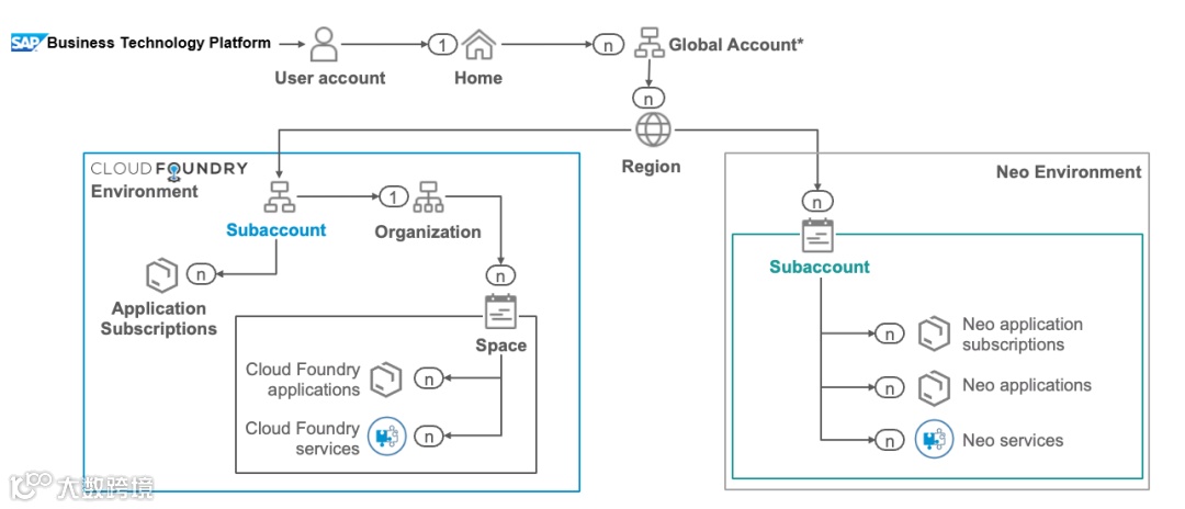 但是实际上后边有很多让初学者迷惑的概念,比如什么是Entitlement(官方中文翻译叫做”权利”,意思就是说我作为客户有哪些服务购买了或者免费使用),如何添加新的用户Role,如何配置到S4本地系统的连接,为什么存在全局账户,子账户,甚至子账户下边还有空间(Space)账户?诸如此类问题,很容易迷失在各种手册和配置中无法自拔,那么下面我就试着从全局层面解释下为什么会有这些设计。