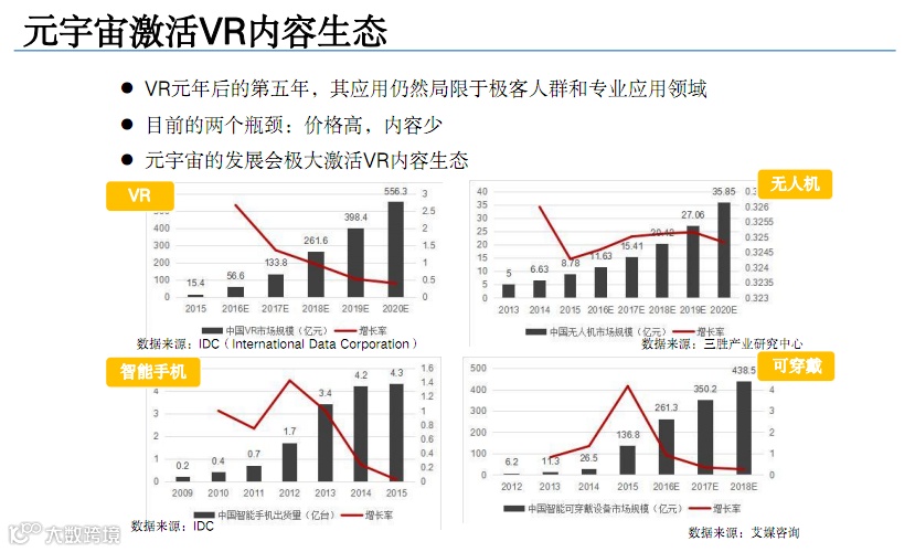 目前,VR、AR、XR技术的大规模应用还存在一些现实的约束条件,离真正具有低延迟、高沉浸的理想体验还有很长的距离。《报告》认为,目前这个产业仍处于“社交+游戏场景”的奠基阶段,还远未实现全产业覆盖和生态开放、经济自洽、虚实互通的理想状态。元宇宙的概念布局仍集中于XR及游戏社交领域,技术生态和内容生态都尚未成熟,场景入口也有待拓宽,理想愿景和现实发展之间仍存在漫长的“去泡沫化”阶段。