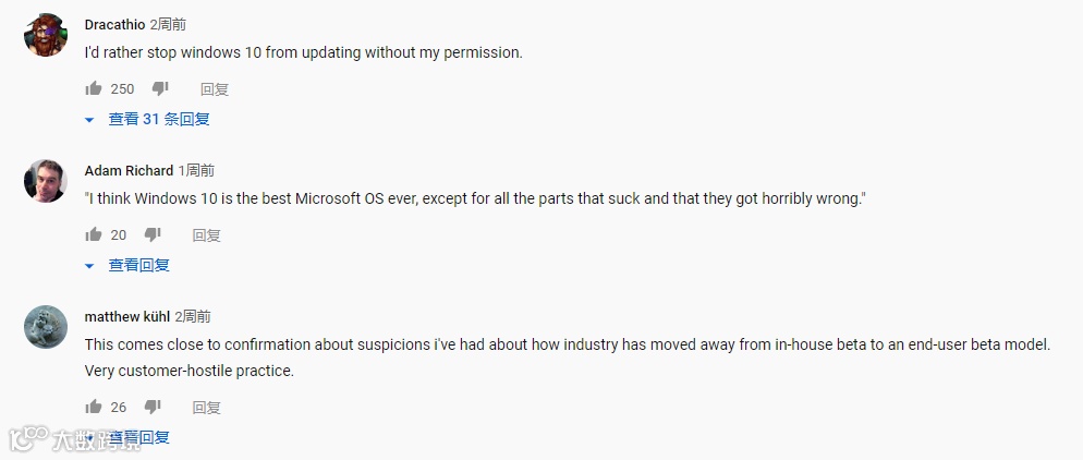 这个视频下不少人也跟着评论,对 Windows 10 的质量义愤填膺。