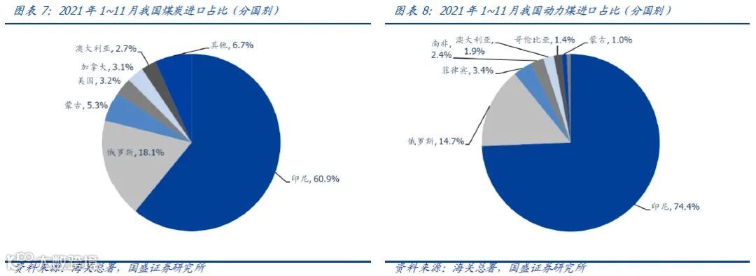 作为我国煤炭/动力煤第一大进口来源国,2021年1~11月,我国进口印尼动力煤1.77亿吨,同比增长54.4%,占进口动力煤总量的74.4%;总量上看,我国去年1~11月累计进口印尼煤1.78亿吨,占比约61%,较去年同期增加6361万吨。