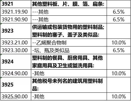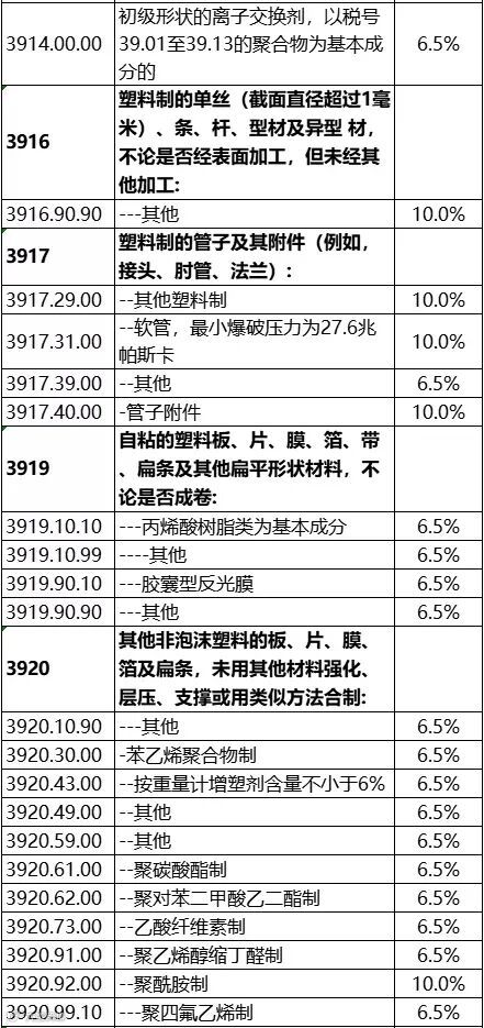 协定生效部分降税以及例外产品的塑料及其制品清单