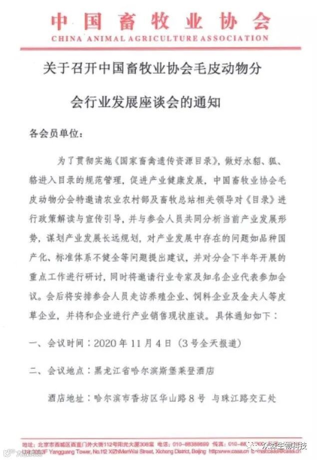 导读:关于召开中国畜牧业协会毛皮动物分会行业发展座谈会的通知