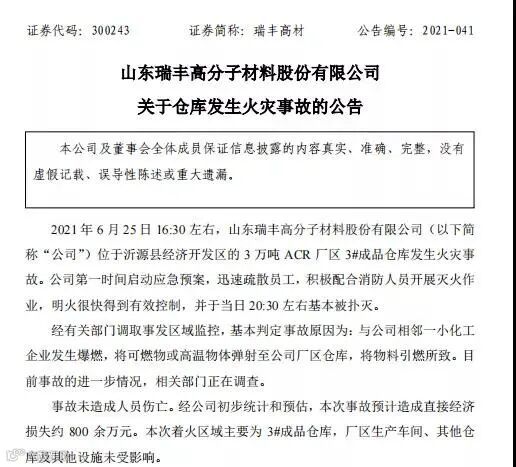6月27日晚间,瑞丰高材(300243,SZ)发布公告称,6月25日16:30左右,山东瑞丰高分子材料股份有限公司位于沂源县经济开发区的3万吨ACR厂区3#成品仓库发生火灾事故。公司第一时间启动应急预案,迅速疏散员工,积极配合消防人员开展灭火作业,明火很快得到有效控制,并于当日20:30左右基本被扑灭。