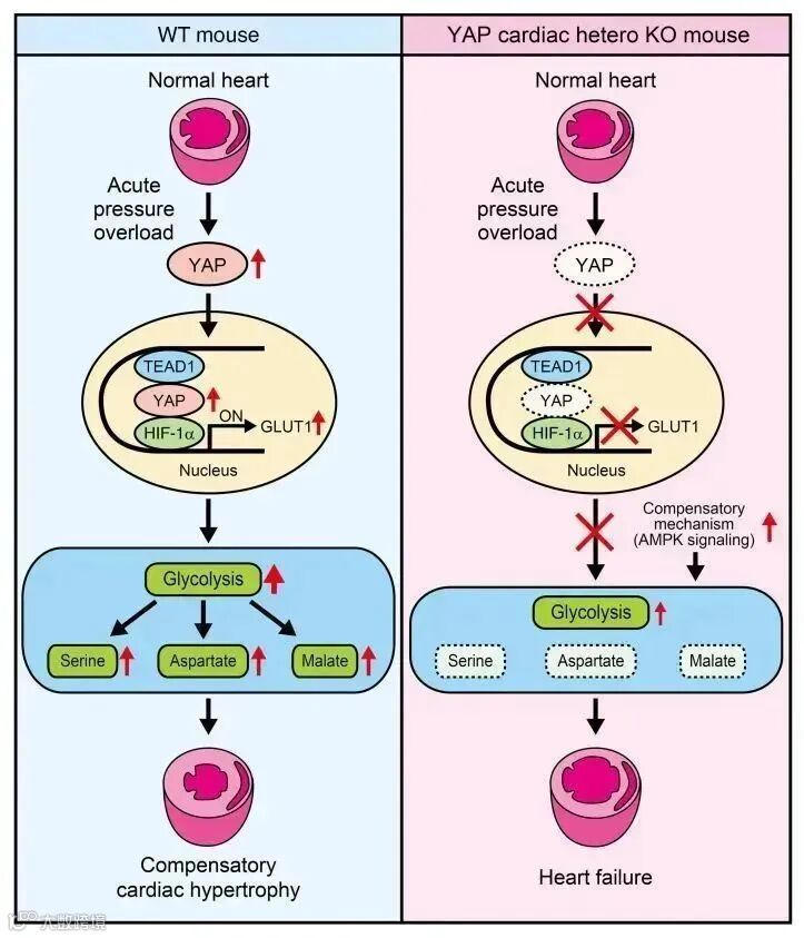 总之,作者的研究结果表明内源性的YAP在介导Warburg效应中起着至关重要的作用,而YAP对代谢中间产物和糖酵解途径的诱导是关键介导代偿性肥厚的。