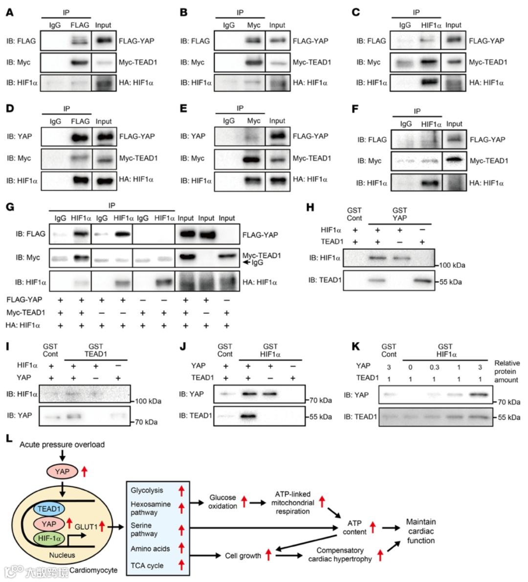 为了确定YAP、TEAD1和HIF-1α在心肌细胞中的相互作用是直接还是间接的,作者进行了体外蛋白质相互作用实验。当重组HIF-1α和TEAD1分别或同时与谷胱甘肽S-转移酶-YAP(GST-YAP)或GST对照一起孵育时,无论是HIF-1α还是TEAD1都能够结合到GST-YAP而不结合到GST对照,表明HIF-1α和TEAD1可以直接与YAP相互作用(图13H)。当重组HIF-1α和YAP分别或同时与GST-TEAD1或GST对照一起孵育时,虽然YAP在任何条件下都能够结合到GST-TEAD1,但只有在YAP的存在下HIF-1α才能结合到GST-TEAD1,表明YAP可以直接与TEAD1相互作用,但HIF-1α只能通过YAP与TEAD1相互作用(图13I)。类似地,当重组TEAD1和YAP分别或同时与GST-HIF-1α或GST对照一起孵育时,虽然YAP在任何条件下都能够结合到GST-HIF-1α,但只有在YAP的存在下TEAD1才能结合到GST-HIF-1α,表明YAP可以直接与HIF-1α相互作用,但TEAD1只能通过YAP与HIF-1α相互作用(图13J)。当等量的重组TEAD1与GST-HIF-1α一起孵育时,结合到GST-HIF-1α的TEAD1量随着重组YAP的存在量成比例增加(图13K)。因此,YAP可以直接与TEAD1或HIF-1α相互作用,但TEAD1和HIF-1α之间的相互作用是通过YAP实现的。这些结果表明,PO诱导的YAP上调以及随之发生的YAP-TEAD1或YAP-HIF-1α相互作用促进了TEAD1-YAP-HIF-1α的相互作用和GLUT1转录的上调(图13L)。