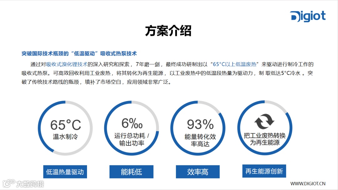 利用工业生产过程所产生的废水废气,制取冷、热工艺制冷节能,节省传统制冷工艺所消耗的煤、电、天然气。满足生产和办公环境恒温需求,替代中央空调,节省非生产环节能耗。创造扩大生产条件,大幅度降低能耗和排放,节省环保指标配额,有助于扩大再生产。