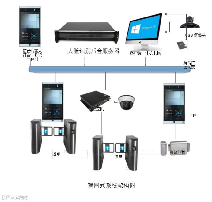客户端管理 PC 套件 管理员使用的 PC 主机,含管 理 PC 、身份证读卡器、 USB 摄像机,用于管理员进行白名 单人脸登记、访客人脸登记、 历史数据查询、系统配置管理、实时通行记录显示等操作。