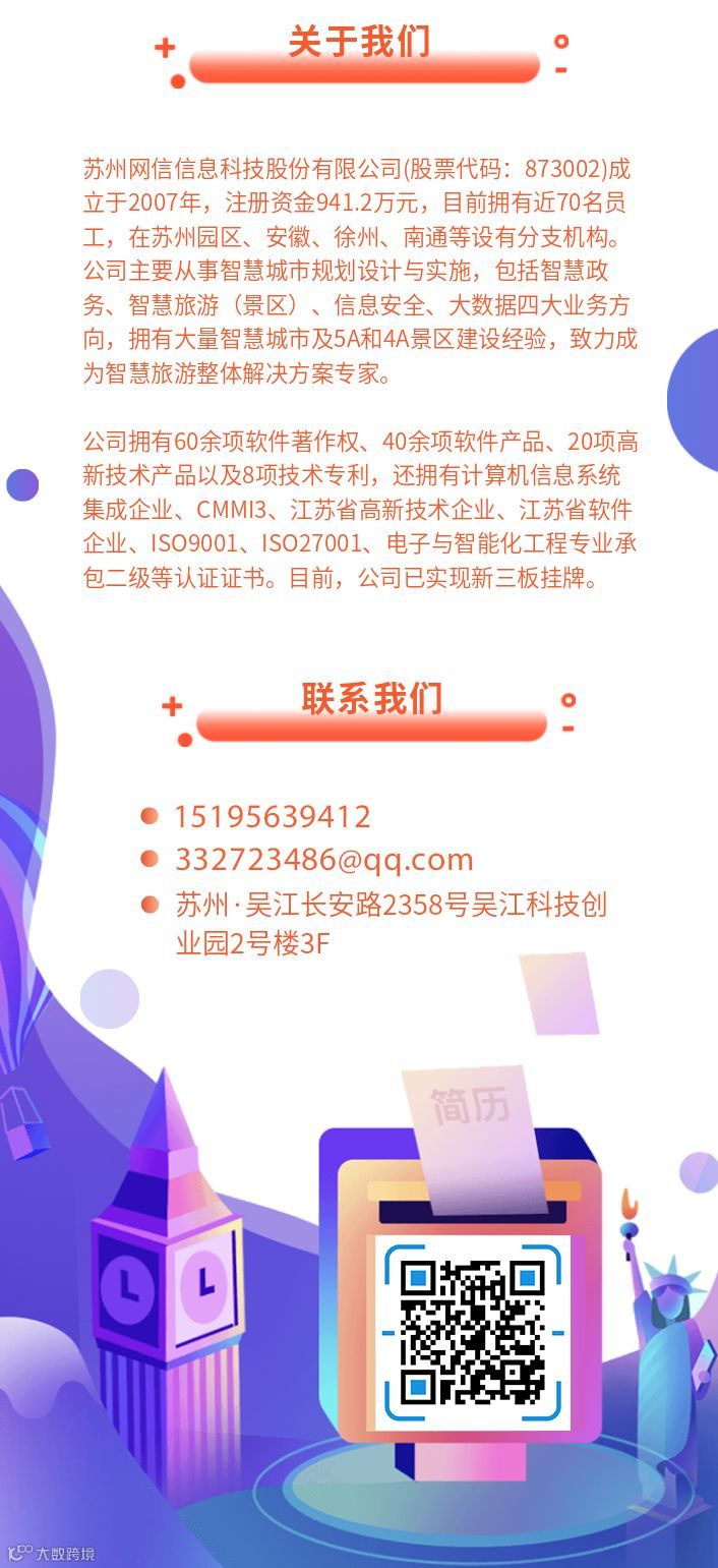 苏州网信信息科技股份有限公司成立于2007年,公司总部设立在江苏省苏州市,目前拥有近百名员工。公司主要从事智慧城市规划设计与实施,包括智慧城市、数字企业、信息安全、信创服务、大数据、云计算、元宇宙等业务方向。