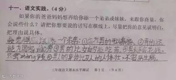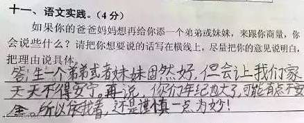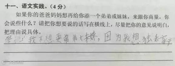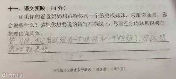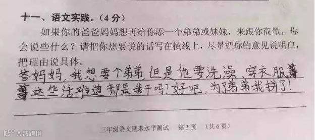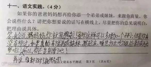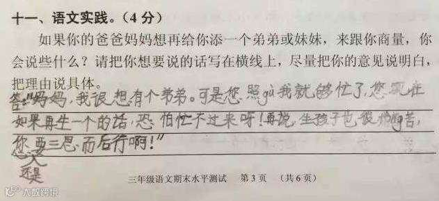 近日,广州天河区小学三年级语文期末考卷上的一题“爸妈想给你添个弟弟或妹妹,找你商量,你会说什么?”崽子们的答案真是各式的牛逼哄哄呀!