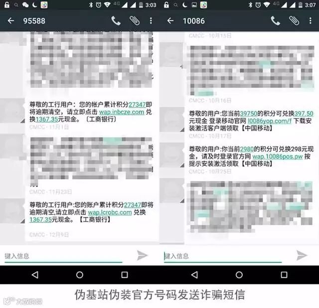 第三重罪:窃取用户相关信息。手机连入伪基站后,手机并不会察觉出伪基站的存在,也会按照和正常基站相同的规则向伪基站发送信息,这也让伪基站拥有了窃取手机用户网络信息的机会。同时通过伪基站下发的诈骗短信,用户一旦点击了诈骗短信上的钓鱼网站,就会被木马或者下载的病毒应用盗取手机内更深层次的信息,例如照片、通讯录甚至银行卡信息等,可谓后患无穷。