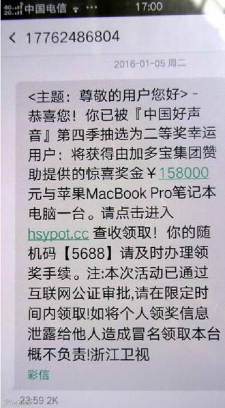 第二种则冒充网购网站中奖,短信中附带一个钓鱼链接网址,用户点进去后,按要求输入身份证、手机号码、账号密码等信息,最终被骗;