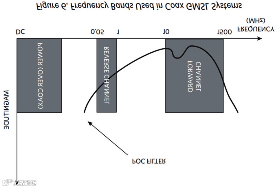 GMSL支持Power Over Coax(同轴供电)功能,要实现此功能,同轴内导体频谱被分为三个频段:供电、反向信道数据、前向信道数据,如下图所示。通过滤波将确切的频段分配至对应的电路。数据通道为AC耦合,通过收发机输入端串联电容实现。