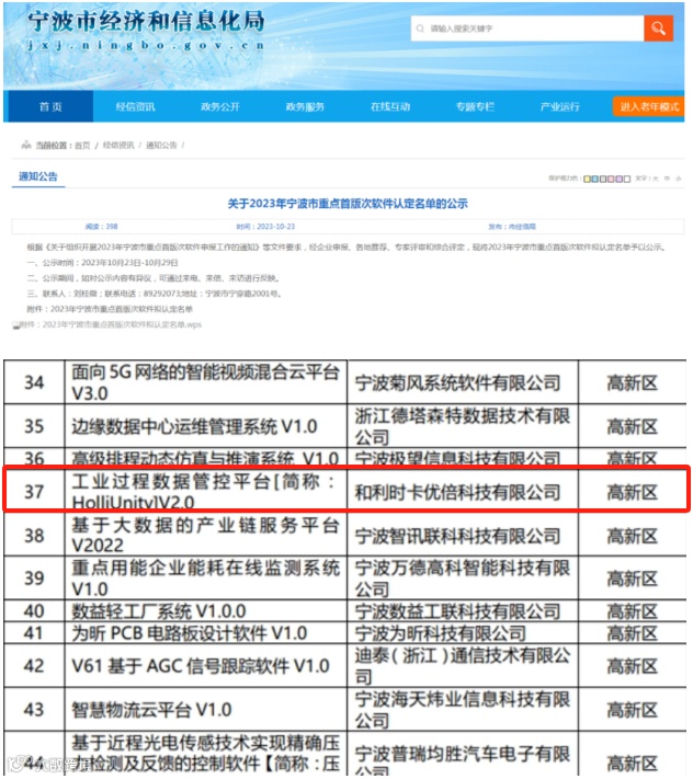 11月2日,宁波市经济和信息化局公布了2023年宁波市首版次软件认定名单,和利时卡优倍HolliCube自主研发的工业过程数据管控平台[简称:HollUnity]V2.0,被认定为宁波市重点首版次软件,并将参与省级评选!