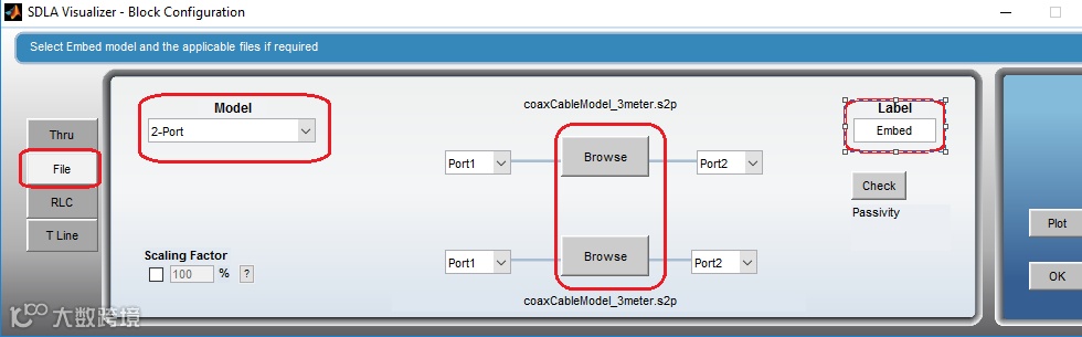 4.2. 在弹出的“Block Configuration” 页面,选择 “File”,在“Model” 下拉列表中选择“2-Port”。点击 “Browse”按键, 定位到: