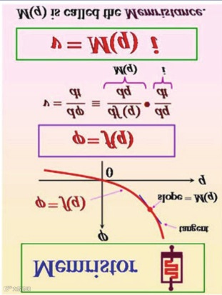 忆阻器是连接磁通量与电荷之间关系的纽带(图一),在无源电路器件中,R揭示了电压与电流之间的关系,L揭示了电流与磁通量之间的关系,C揭示了电压与电量之间的关系,而电量与磁通量之间的关系,很久以来一直未受到关注。1971年,美籍华裔科学家蔡绍棠教授从电路理论完备性角度预测除电阻、电容、电感之外,还存在第四种遗失的无源基本电路元件,表征电荷与磁通量之间的关系,并从数学上进行了推到(图二),将该遗失的无源器件命名为忆阻器②。