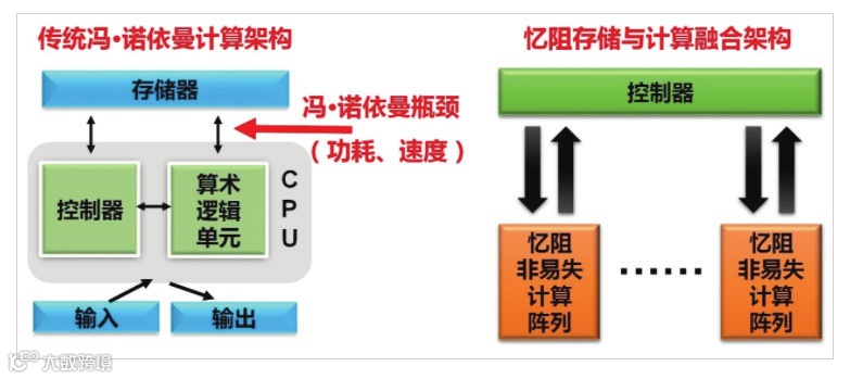 忆阻器备受关注的重要应用领域包括:非易失存储(Nonvolatile memory),逻辑运算(Logic computing),以及类脑神经形态计算(Brain-inspired neuromorphic computing)等。这三种截然不同又相互关联的技术路线,为发展信息存储与处理融合的新型计算体系架构,突破传统冯·诺伊曼架构(图四左)瓶颈,提供了可行的路线。