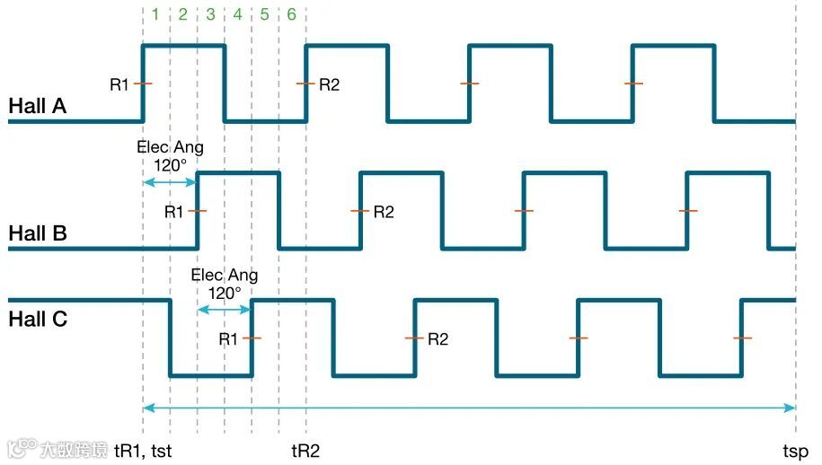 图35. 三个霍尔传感器提供反馈,控制系统根据反馈确定转子位置。此例显示了四极对电机的六步换向。机械旋转的开始时间为 tst。旋转结束时间为tsp。一次机械旋转包含四个电循环。IMDA软件可以利用这些信息来测量速度、方向和加速度。