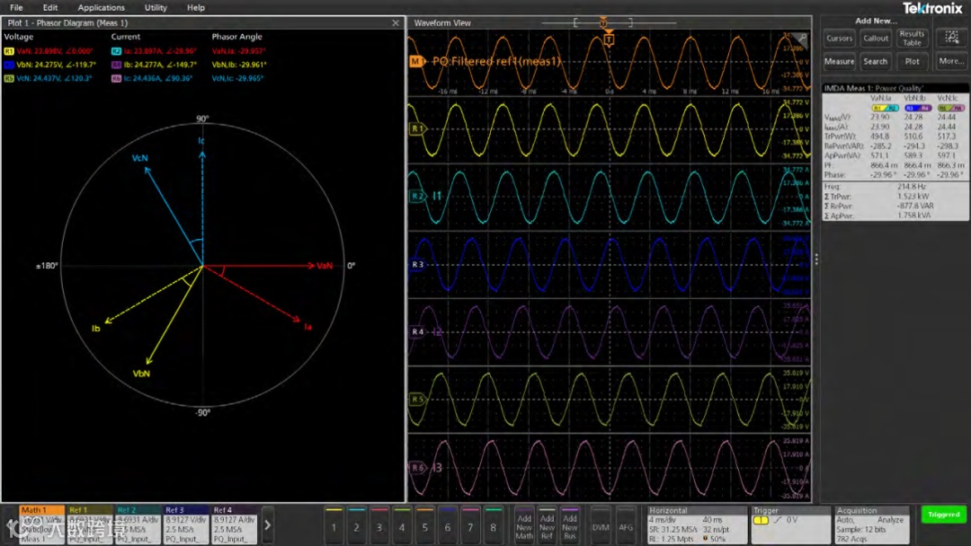 电能质量测量可用于确认探头和接线配置是否正确。如果一个或多个功率测量显示负读数,请检查您的电流探头,确认与负功率读数相关的通道上的探头是否连接错误。对于三相系统,请检查相量图。正常情况下,各相电压应基本相同,相位差为120°。