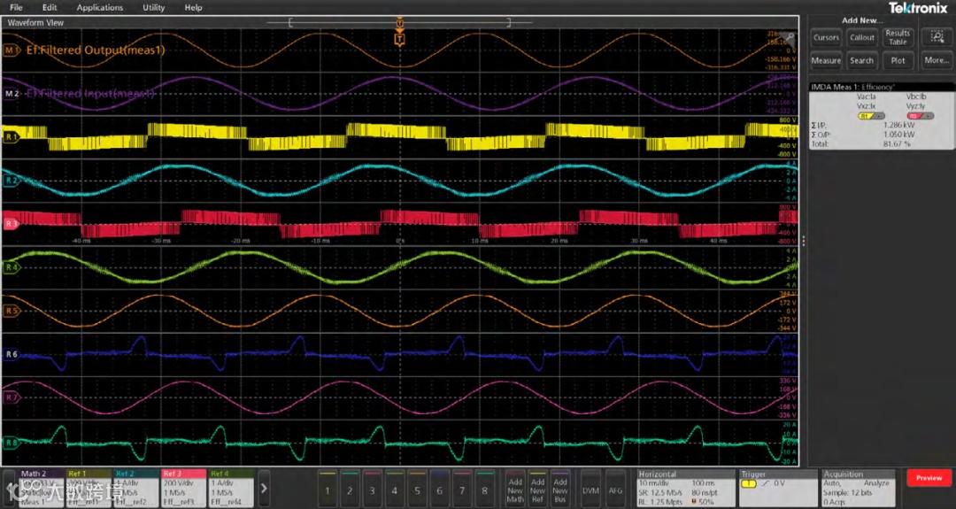图31. 使用8个示波器输入通道测量三线输入三线输出系统的驱动效率。
