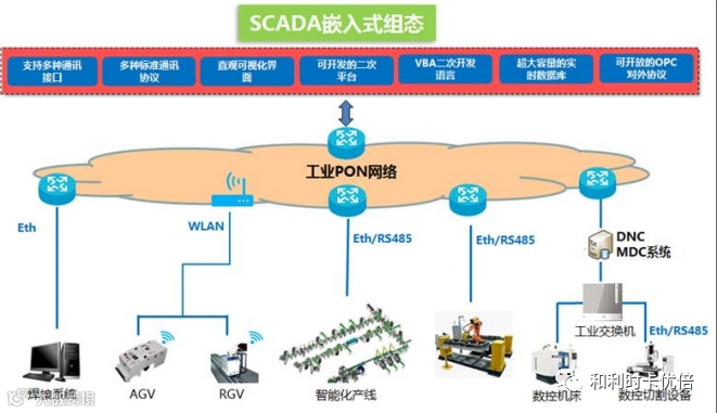 设备互联与数据采集:采用工业互联网技术和网络转换协议技术,实现设备、产线及系统的网络连接。通过SCADA嵌入式组态软件,进行实时数据采集、存储及分析。实现生产制造过程数据交互,为后续的数据服务提供真实的依据。