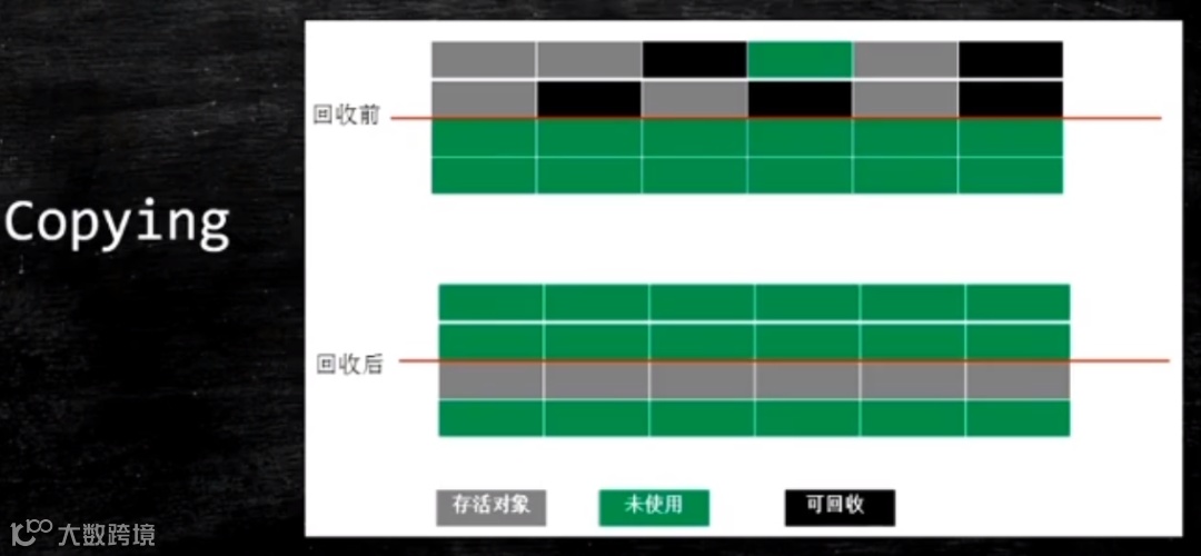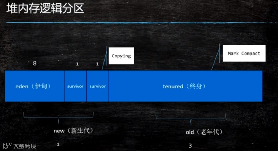 (5) 伊甸区eden的对象在经过一次GC后,如果没有被回收掉,JVM在整个new新生代区都采用Copying(拷贝算法),将不是垃圾的对象拷贝到幸存者区survivor1,对比上面的堆内存逻辑分区图。幸存者区survivor1中的对象再经过一次GC后如果对象还存活,那么就拷贝到幸存者区survivor2并且清理掉幸存者区survivor1中的所有对象,再有GC就反复这个操作,直到对象的分代年龄达到了移到老年代的界限(一般分代垃圾回收器默认是15,CMS默认是6),就会被移到老年代中,老年代采用标记压缩(mark compact)算法,保证内存的连续性 。