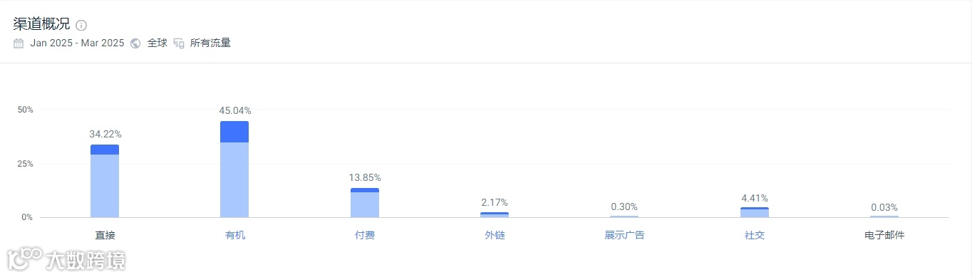 根据similarweb数据显示,Happiest Baby官网的流量主要来自于自然搜索流量(45.04%)、直接访问流量(34.22%)、付费搜索(13.85%)。