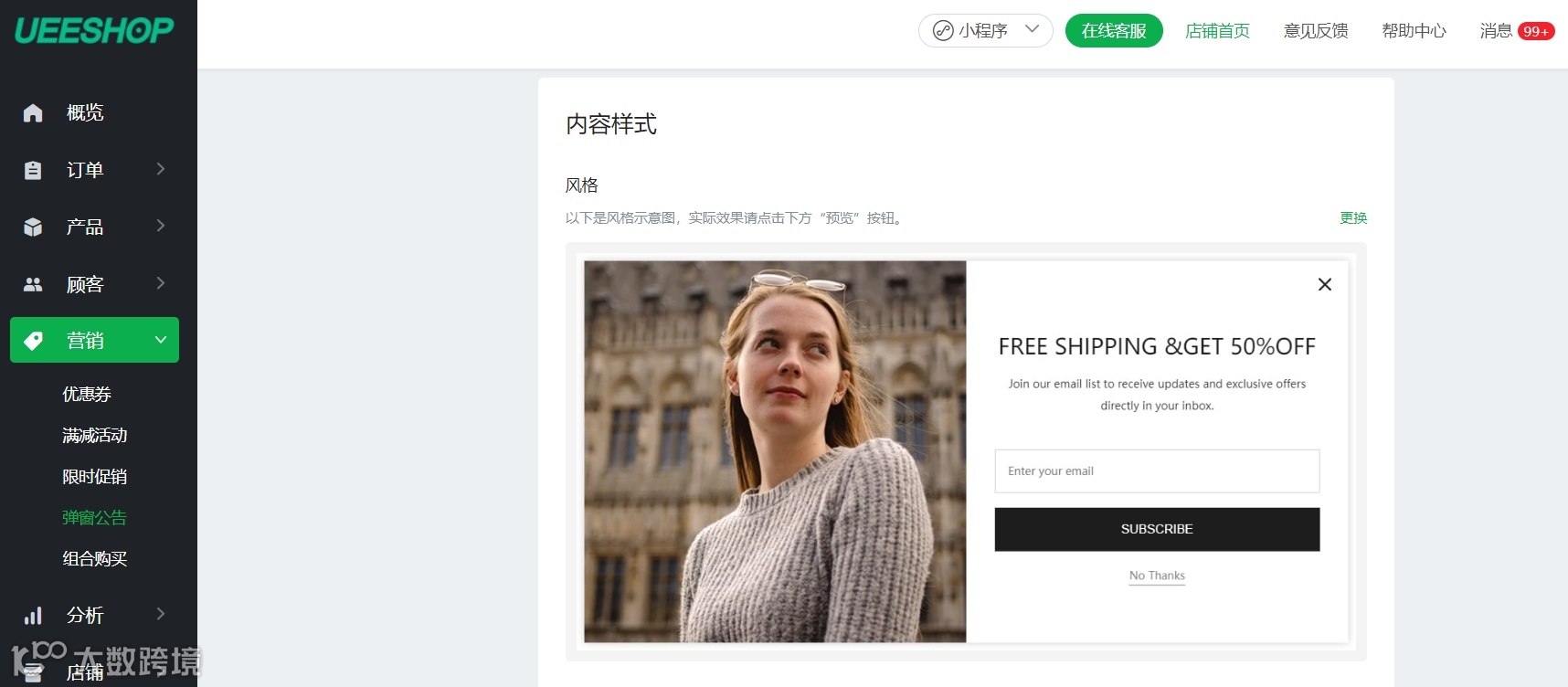 Ueeshop弹窗公告功能,可为不同场景,包括用户订阅、会员注册、挽留购买等,添加折扣弹窗,这一方面能够鼓励消费者注册或订阅,另一方面,赠送优惠券,也有可能促使消费者产生购买行为。