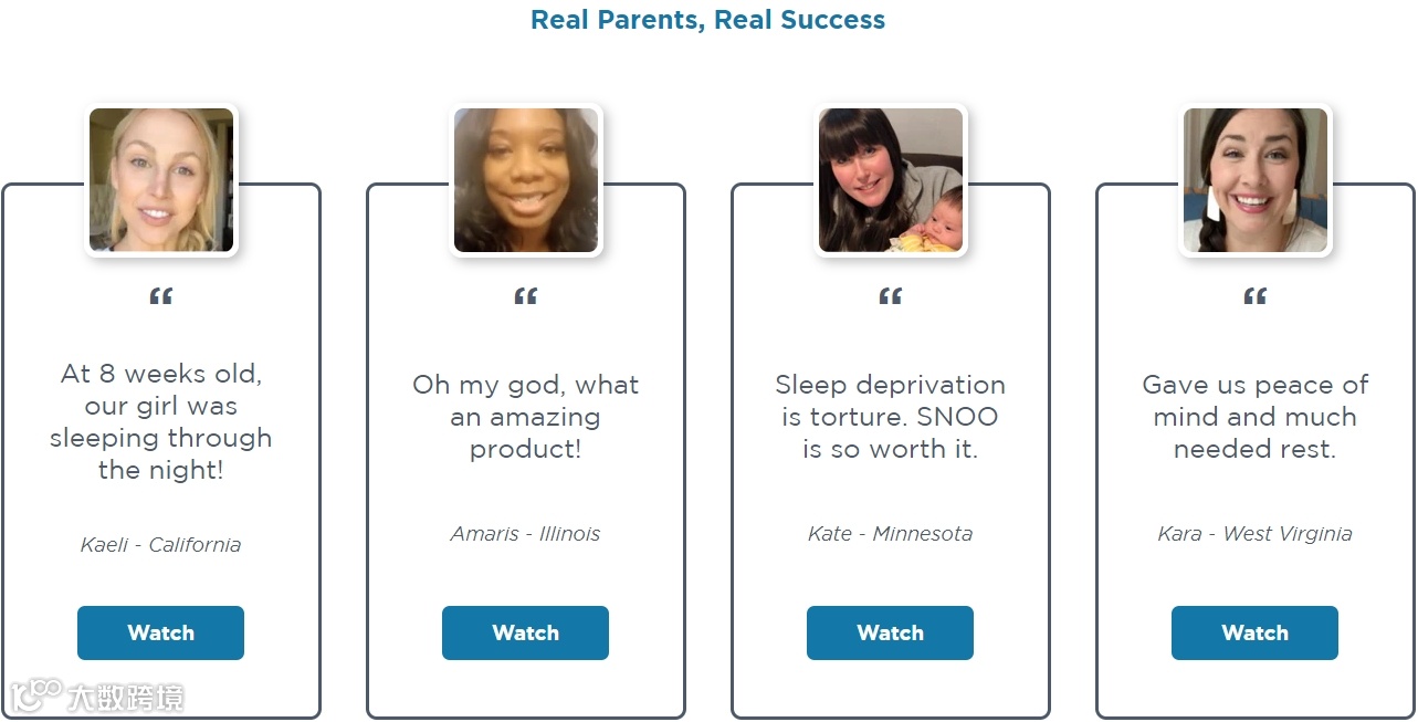 Happiest Baby在其官网展示了大量的用户评价,由真人出镜讲述自己的实际感受。这些内容真实、自然,画面中流露出的疲惫、情绪的释放,是能够促使潜在用户迅速代入,从而产生“我也想要这个帮助”的共鸣,进而激发购买欲望。