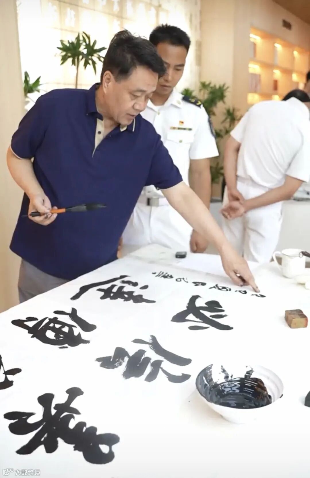 面对官兵们的需求,艺术家们耐心回应。“能为咱们海军官兵写一幅‘逐梦深蓝’吗?” 一位年轻战士话音刚落,高正石、李小成便默契配合完成作品。从部队领导到普通官兵,百余幅 书法作品,贴合军营生活,传递奋进力量。