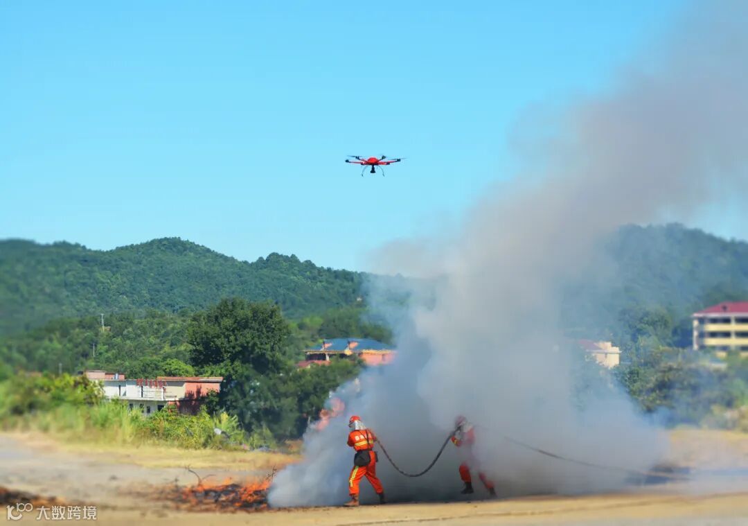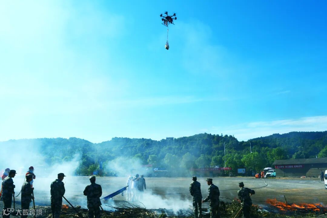 图为博迅“大载重、长航时”油动无人机为消防指战官兵运输、精准投送应急物资。