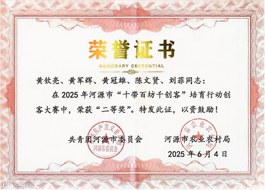 2025 年 6 月 4 日,由河源市 “百千万工程” 指挥部办公室、深圳对口帮扶协作河源指挥部指导,共青团河源市委员会、河源市农业农村局主办的 2025 年河源市 “十带百坊千创客” 培育行动创客大赛决赛在舞台上圆满落幕。博溯星(广州)数字科技有限公司 “数农云链・花生新语” 项目团队表现出色,从113个创业、创意项目决赛队伍中脱颖而出,荣获大赛(创业组)二等奖并获奖金贰万元。