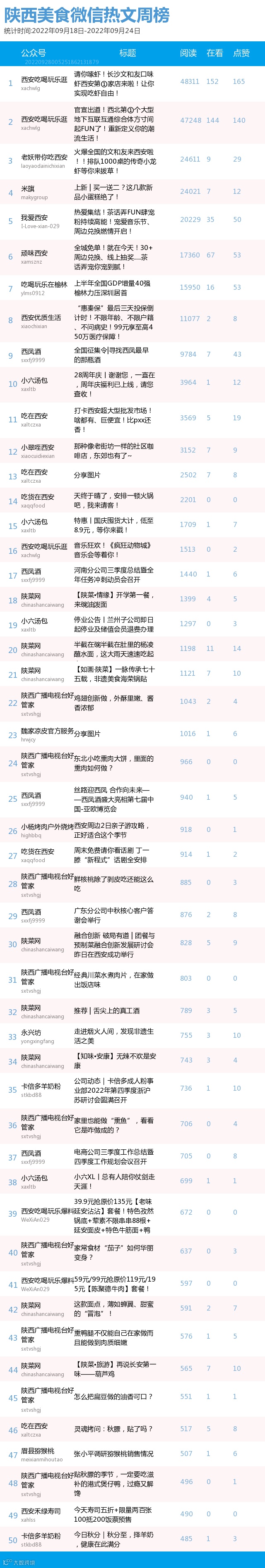 最新陕西美食类微信公众号50强重磅出炉!TOP50上周共计发文192篇,阅读总量达到24万+,在看总量达到512。阅读总量较上周有所上升,希望下期各大平台再接再厉!(查看榜单可直接下滑)