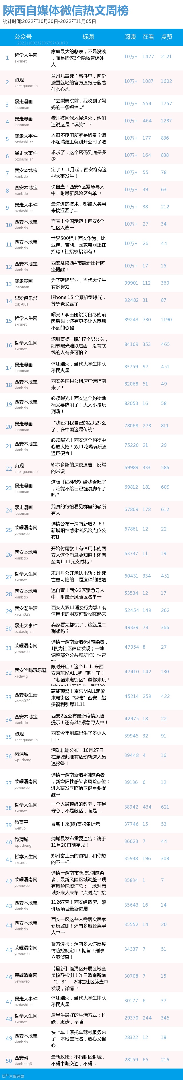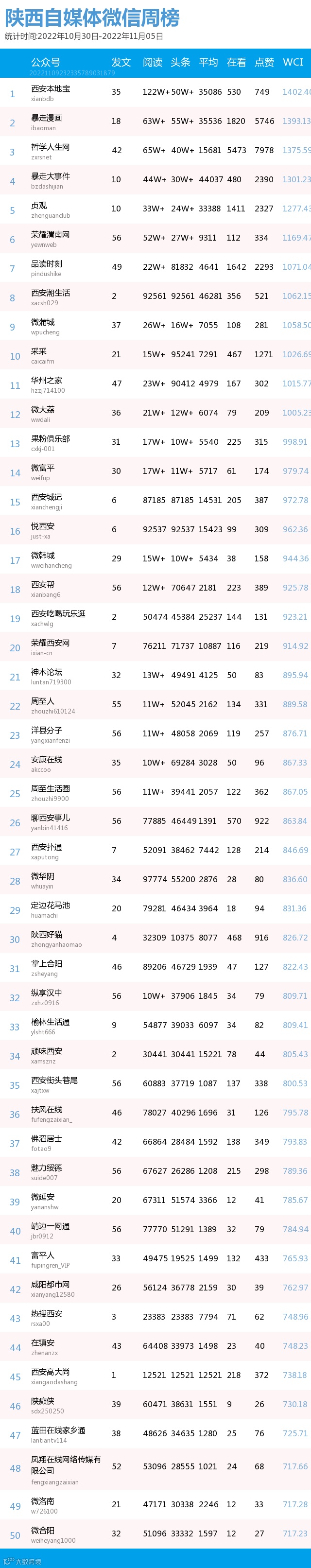 最新陕西自媒体微信公众号50强重磅出炉!TOP50上周共计发文1562篇,贡献阅读总量792万+,在看总量1万+,阅读总量较上周有所下降,希望下期各大平台加油哟~(查看榜单可直接下滑)