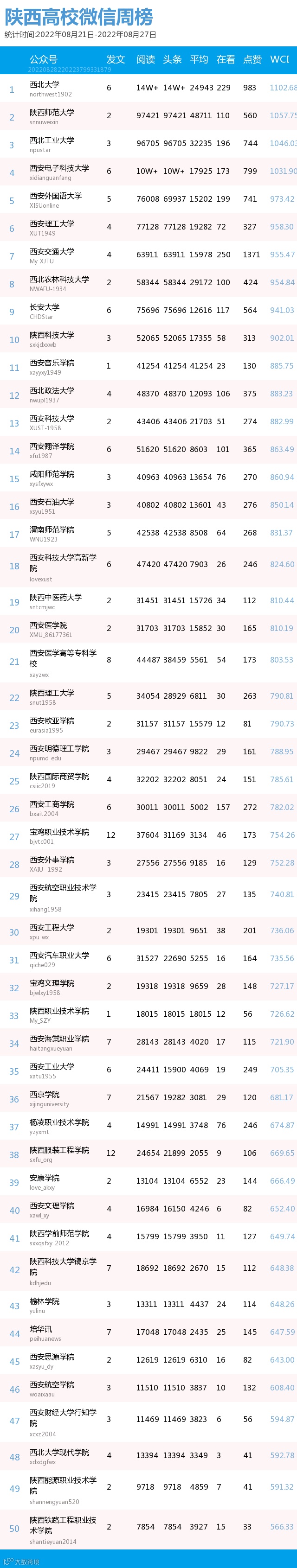 最新陕西高校微信公众号50强重磅出炉!TOP50上周共计发211篇,贡献阅读总量191+,在看总量2858,阅读数据较上周有所上升,希望各大平台下期继续加油哦~(查看榜单可直接下滑)