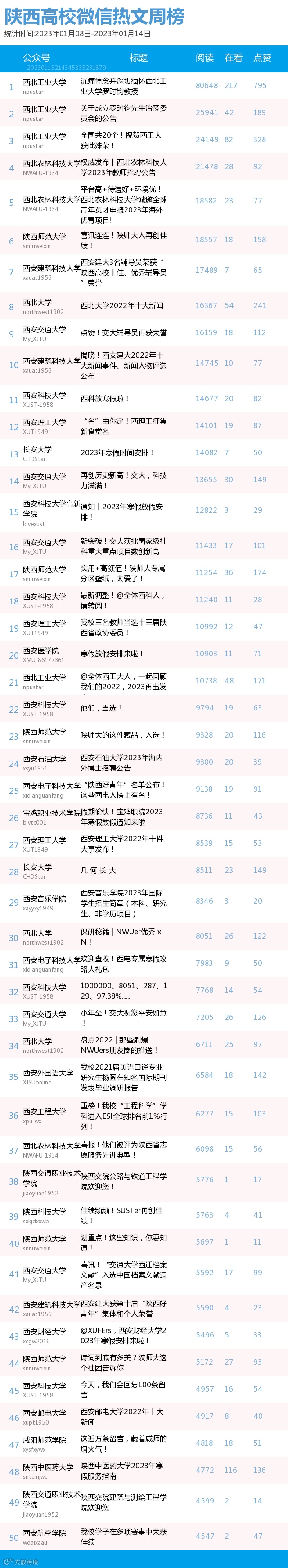 最新陕西高校微信公众号50强重磅出炉!TOP50上周共计发199篇,贡献阅读总量81W+,在看总量2380,阅读数据较上周有所下降,希望各大平台下期继续加油哦~(查看榜单可直接下滑)