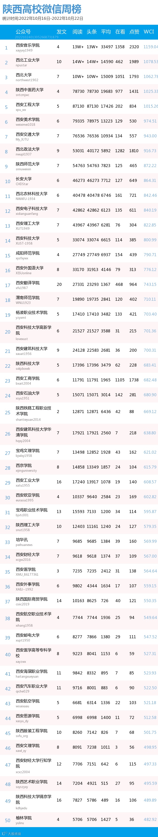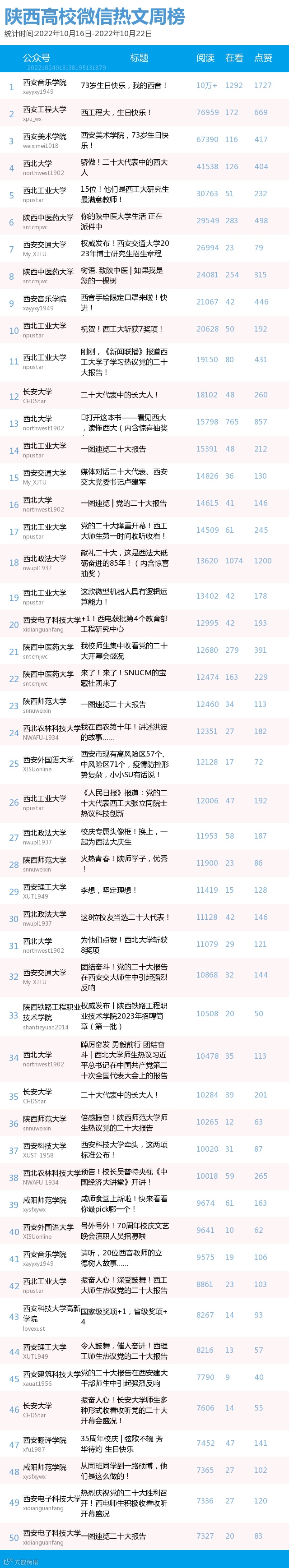 最新陕西高校微信公众号50强重磅出炉!TOP50上周共计发383篇,贡献阅读总量148W+,在看总量9213,阅读数据较上周有所下降,希望各大平台下期继续加油哦~(查看榜单可直接下滑)