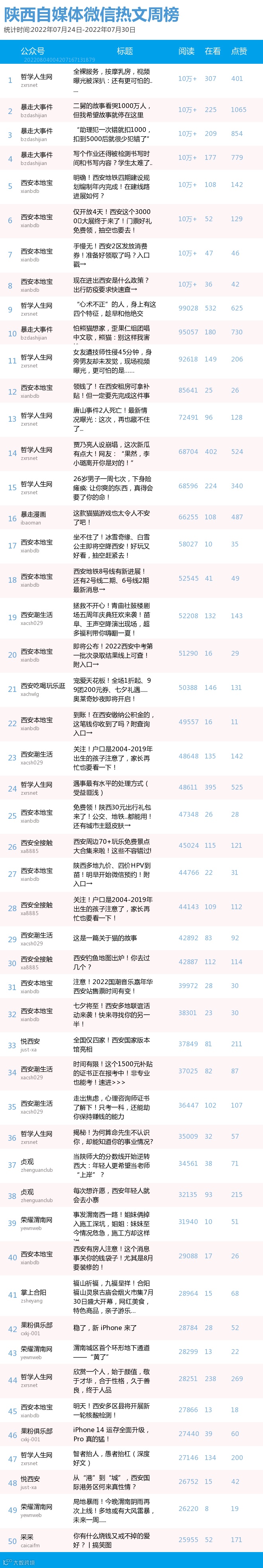 最新陕西自媒体微信公众号50强重磅出炉!TOP50上周共计发文1430篇,贡献阅读总量672万+,在看总量1万+,阅读总量较上周有所下降,希望下期各大平台加油哟~(查看榜单可直接下滑)