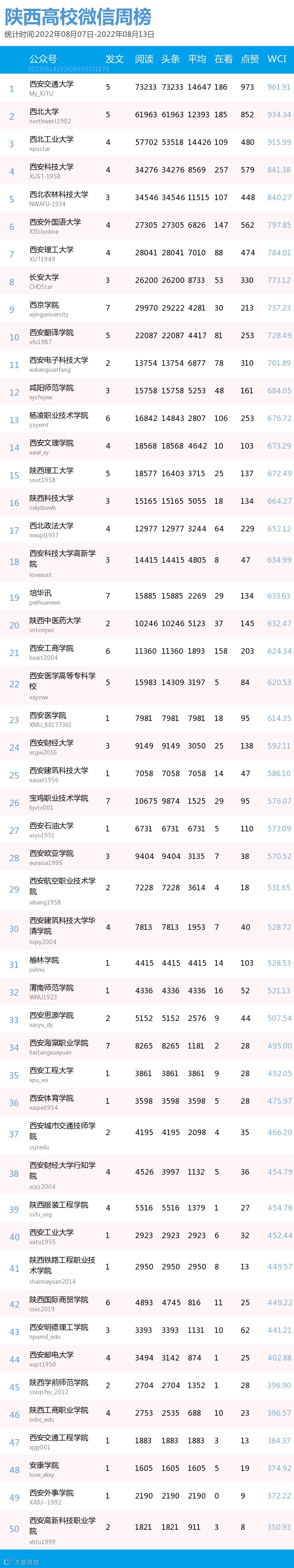 最新陕西高校微信公众号50强重磅出炉!TOP50上周共计发165篇,贡献阅读总量71w+,在看总量2061,阅读数据较上周有所下降,希望各大平台下期继续加油哦~(查看榜单可直接下滑)