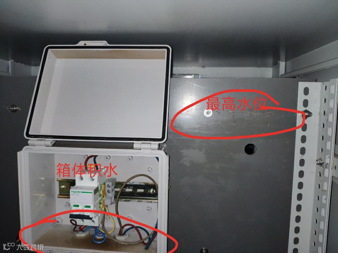 现场检查:配电箱积水未清理,断路器底部有水滴,有漏电风险,拆开检测,断路器无积水浸没痕迹,断路器底部水滴应为凝集水滴;探头快接三通拆开后无积水,无泥垢,密封效果良好;主控箱底部有进水后残留的泥渍,电控接线部分没有被积水浸没,保留完好。