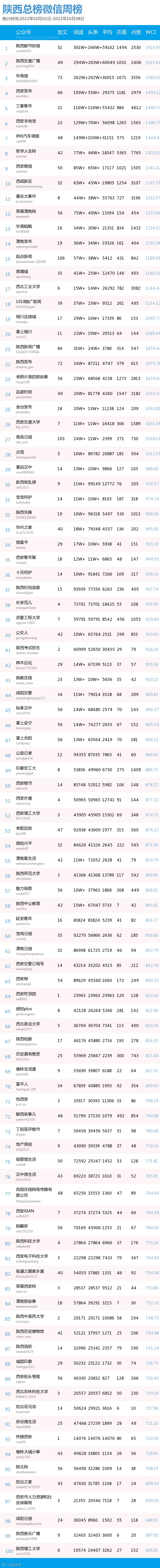 最新陕西总榜微信公众号100强重磅出炉!TOP100上周共计发2864篇,贡献阅读总量2658W+,在看总量3W+,阅读数据较上周有所上升,希望各大平台下期继续加油哦~(查看榜单可直接下滑)